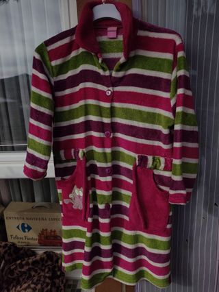 Bata de invierno con estampado de rayas multicolor. Es cómoda y suave, ideal para estar en casa. Esta usada pero aun la queda mucho, comprada en merceria, es de muy buena calidad, la quito por talla - Diseño a rayas verdes, rosas y moradas. - Cuello de solapa. - Cierre de botones. - Dos bolsillos delanteros con un simpático dibujo de gato.