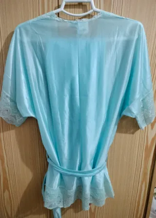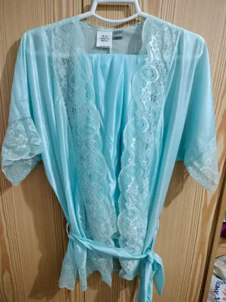 Precioso pijama de satén con un tacto muy suave y agradable. Tiene encaje en las dos partes - Diseño elegante con detalles de encaje. - Cinturón para ajustar a la cintura. - Manga corta y corte holgado.