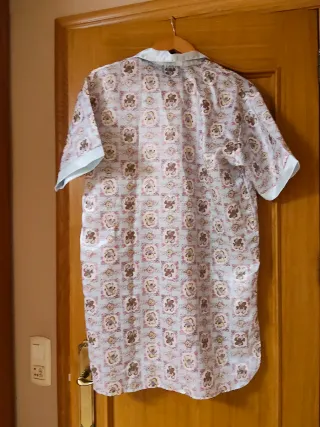 Pijama de satén con estampado de ositos. Es ligero y cómodo. De hombro a hombro 49 cm De axila a axila 51 cm Largo 81 cm - Manga corta. - Cuello camisero. - Cierre de botones.