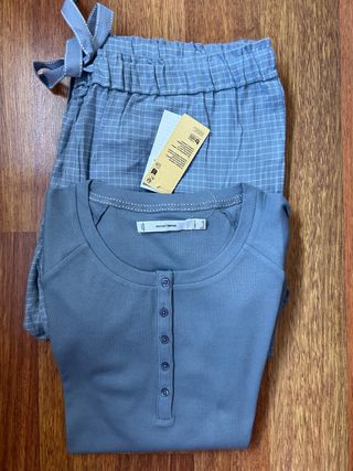 Conjunto de pijama de dos piezas. - Camiseta de manga corta con botones. - Pantalón largo con estampado de cuadros y lazada. - Tejido suave y cómodo.
