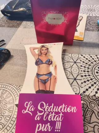 Conjunto de lencería femenina con un diseño llamativo. - Pieza superior con detalles de encaje. - Braguita a juego con tiras. - Incluye portaligas. -Tambien incluye medias