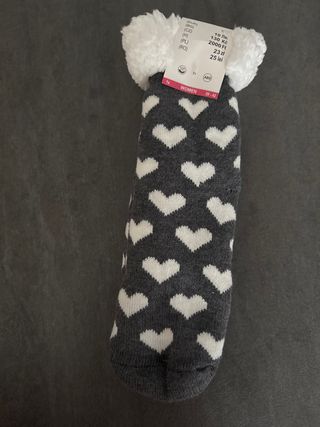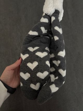 Calcetines gruesos para estar en casa, con un bonito estampado de corazones blancos sobre fondo gris. Forrados de pelito, muy calientes - Talla: 39-42 - Material: ABS Lo vendo nuevo, a estrenar porque no es mi talla