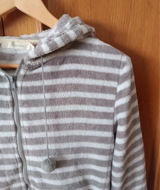 Batín cómodo para estar por casa o para el descanso. - Diseño a rayas. - Cierre de cremallera. - Capucha. - Bolsillos delanteros. - Le falta una de las bolas, como se ve en la imagen.