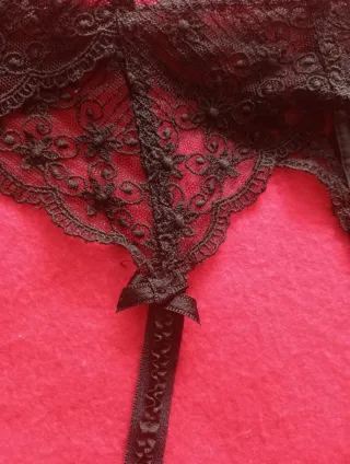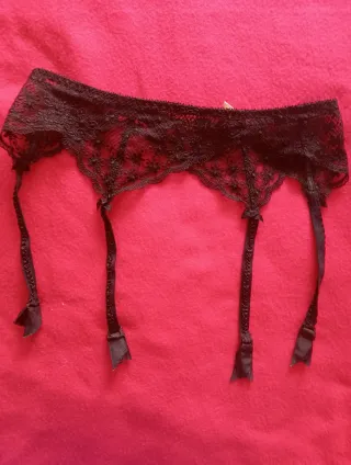 Liguero de encaje negro con tirantes ajustables. - Diseño delicado con bordados, lorzas y lazos. - Detalle de lazos en los tirantes. - Cierre en la parte trasera, con CD INICIALES DE LA PRESTIGIOSA MARCA.