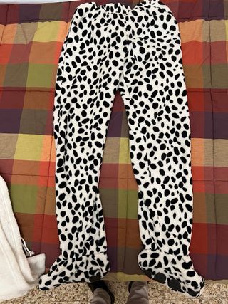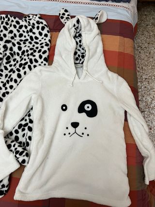 Pijama de invierno con divertido diseño de perro dálmata. Ideal para estar cómodo en casa. - Tejido suave y cálido. - Capucha con orejas. - Estampado de manchas negras sobre fondo blanco.