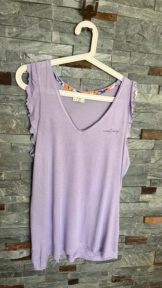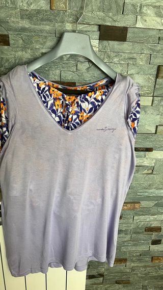 Conjunto de pijama de verano para mujer con un diseño vibrante. - Parte superior de manga corta en tono lila. - Estampado floral en tonos azules y naranjas en la parte interior y mangas. - Cuello en V. - fresco y cómodo. Agradable al tacto.