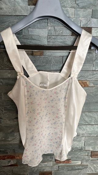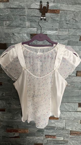 Conjunto de pijama lencero con un delicado estampado floral. - Diseño de tirantes. - Tejido ligero y vaporoso. - Detalle de lazos. - Escote con volantes.