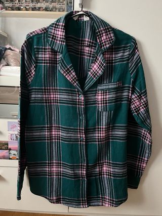 Pijama de cuadros para mujer con un diseño clásico y cómodo. - Tejido suave y cálido. - Estampado de cuadros en verde, rosa y negro. - Cuello camisero y botones frontales.