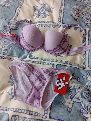 Conjunto de lencería de la marca SK Selnova. Nuevo con etiquetas - Talla 90C, el sujetador, la braga M. - Diseño con detalles de encaje. - Tejido semitransparente.