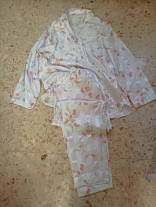 Conjunto de pijama de satén raso con estampado floral. - Tejido suave y brillante. - Diseño de camisa de manga larga y pantalón largo. - Estampado delicado de flores y hojas. Las fotos forman parte de la descripción.