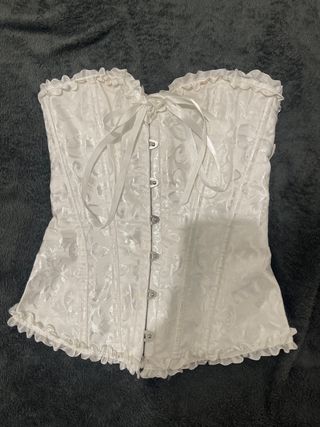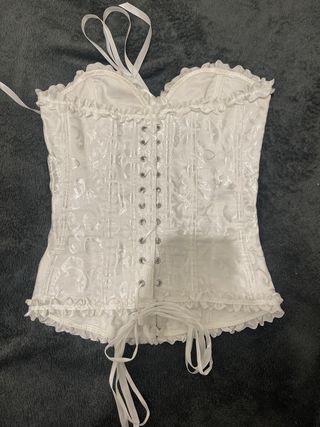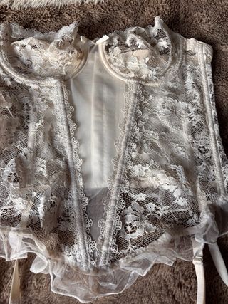 Corsé elegante de color blanco con un diseño jacquard y detalles de volantes. - Tejido con estampado floral. - Cierre frontal de corchetes. - Adornado con lazos decorativos en la parte delantera. - Ribete de volantes en escote y bajo.