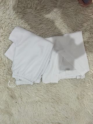 Conjunto de pijama sanitario de color blanco. Incluye pantalón y chaqueta. - Pantalón con cintura elástica y cordón. - Chaqueta con cuello en V.