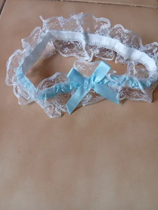 Liga para novia con detalles de encaje y lazo. - Diseño delicado con encaje blanco. - Cinta azul con un lazo. - Talla única.