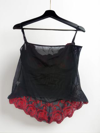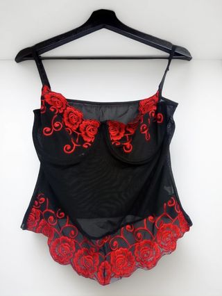 Bonito bustier corsé con detalles de encaje floral, en color rojo y negro, transparente. Bordado de rosas rojas. Tirantes ajustables. (en la etiqueta pone L pero da una S), marca D.M. Medidas: 28 cm largo x 33 cm ancho. Material: 95% poliester. si eres de Zaragoza se puede recoger en San José, Aragonia o Parque Grande.