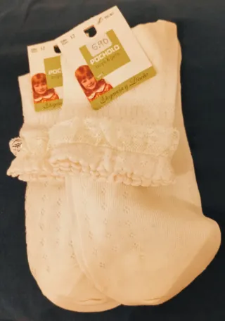 Calcetines blancos con detalle de encaje en el borde. - Diseño con puntilla. - Ideales para ocasiones especiales. - Varias tallas: talla 0 y 2.