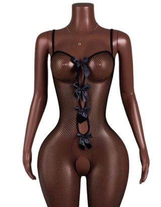 Prenda de malla con un diseño atrevido y sensual. - Detalle de lazos en la parte frontal. - Abertura en la entrepierna.