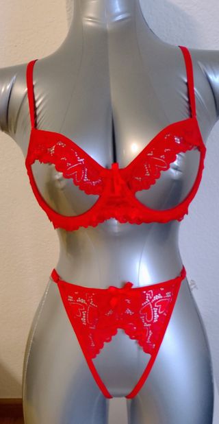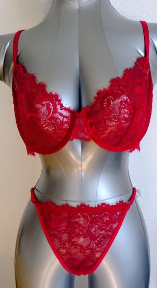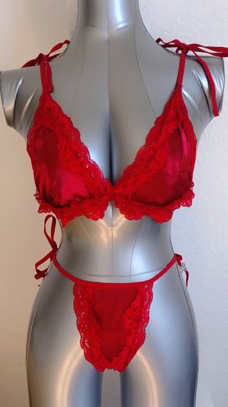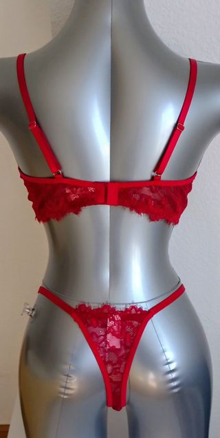 Conjunto de lencería de dos piezas en color rojo. Nuevo. - Sujetador con copas triangulares y detalles de encaje. - Braguita a juego con tiras laterales ajustables.