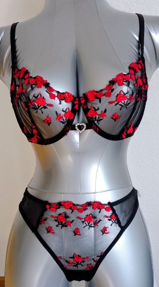 Conjunto de lencería sexy con un diseño delicado y romántico. - Encaje transparente con bordado de rosas rojas. - Detalle de corazón con pedrería en el centro del sujetador. - Tanga a juego con detalles de encaje.