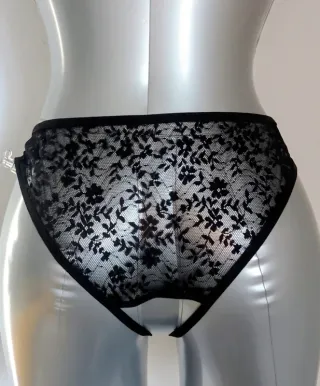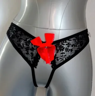 Conjunto de lencería de dos piezas con un diseño atrevido y elegante. - Sujetador con copas abiertas y detalles de encaje. - Braguita tipo tanga con abertura. - Adornado con pequeños lazos.