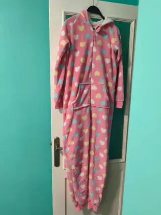 Pijama enterizo de Primark con un divertido estampado de corazones. - Diseño de una sola pieza con capucha. - Cremallera frontal para facilitar su uso. - Bolsillos delanteros. - Tejido suave y cálido.