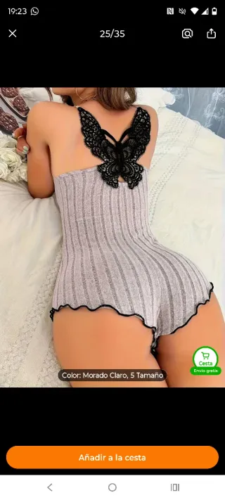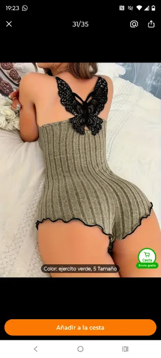 Este pijama de una pieza tiene un diseño único. - Color verde militar. - Detalle de encaje negro en forma de mariposa en la espalda. - Tejido acanalado. - Acabado ondulado en los bordes. Varias tallas i colores
