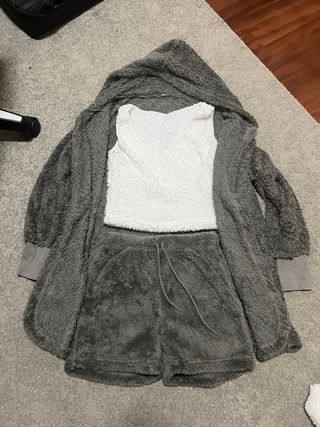 SE VENDE LAS TRES PIEZAS JUNTAS 2 Conjunto de pijama de mujer y una bata muy suave y calentito, perfecto para estar cómoda en casa. - Tejido de peluche. - Incluye camiseta y pantalón.