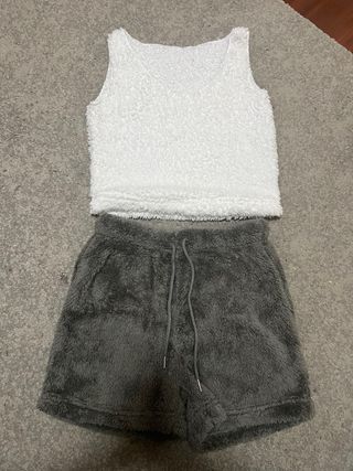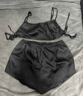 Conjunto de pijama de dos piezas, ideal para el verano. Incluye top y pantalón corto. Tejido satinado. Tirantes finos ajustables en el top. Cintura elástica en el pantalón corto. Me lo he puesto una sola vez, muy bien conservado. Lo tengo en color verde menta también, si compras los dos colores sale por 15€. ¡Acepto ofertas y envío rápido