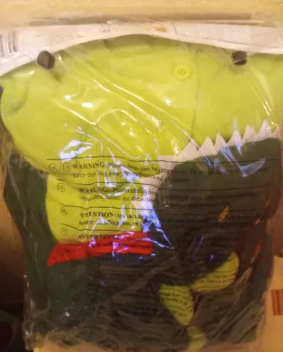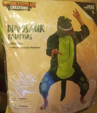 Disfraz tipo pijama de dinosaurio de Spooktacular Creations. - Talla L para adulto. - Diseño de dinosaurio verde y azul. - Incluye 1 pieza (pijama). - Puesto solo una vez Tiene unos puntos como de quemado pero no tiene agujeros muy leves . El resto está en perfecto estado