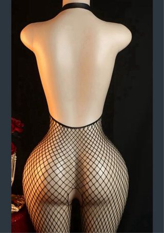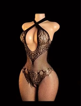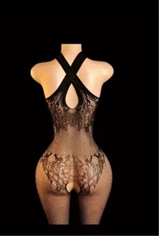 Este body de malla es una pieza llamativa y atrevida. - Diseño de red. - Escote pronunciado con tiras cruzadas. - Aberturas estratégicas en el torso y caderas.