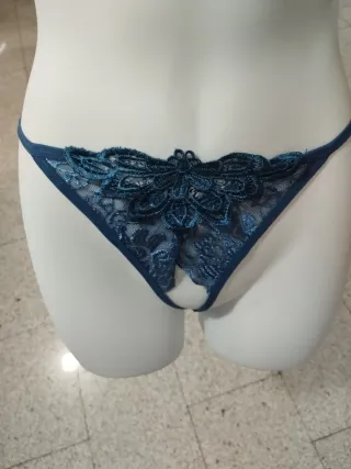 Este tanga es una pieza delicada y seductora. - Diseño abierto. - Detalle de encaje con forma de mariposa en la parte delantera. - Tira fina. - Tejido con un ligero brillo.