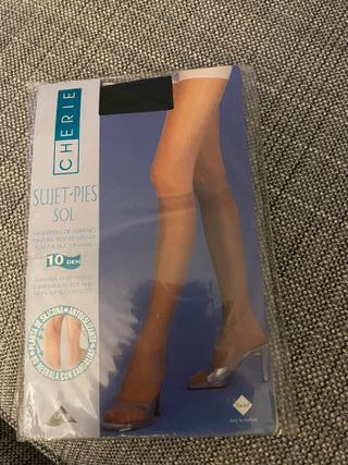Medias sujetapiés transparentes de verano, color negro, talla única, medida hasta rodilla, sin estrenar. - Modelo: Sujet-pies Sol. - Marca: CHERIE. - Grosor: 10 DEN. - Diseño: Verano, transparentes. - Planta: Silicona antideslizante, no resbala con sandalias.