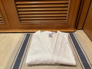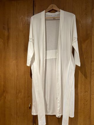 Se trata de una preciosa bata blanca de algodón, perfecta para el verano. Manga tres cuartos con una preciosa puntilla. Dos bolsillos y con un bonito lazo para atar a la cintura. En la etiqueta pone talla 44 pero no se corresponde a esa talla. sería más bien una talla 40. En perfectas condiciones salvo por una pequeña mancha en la parte de detrás, en la espalda, que no he conseguido eliminar con nada, puedes verla en la última foto. Largo 103 cm Pecho 44cm Si quieres te la puedo enviar Más artículos en mi perfil, pásate y mira.