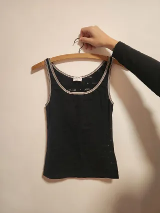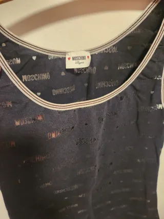 Camiseta tipo lencería de la marca Moschino. - Color negro. - Ribete en cuello y sisas. - Letras Moschino en transparencias