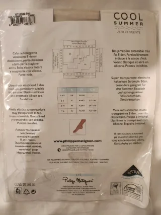 Medias elásticas de la marca Philippe Matignon, modelo Cool Summer. - Calza autoreggente. - Velatissima 8 denari. - Ultra-sheer elasticated 8 den. - Muy transparente 8 den. - Bas jarretière extensible tres fin 8 den. - Lycra Satin Sheers.