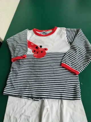 Conjunto de pijama para niña con un divertido diseño. - Camiseta de manga larga con rayas marineras y detalle de mariquita. - Pantalón blanco con detalles rojos y azules en los bajos.