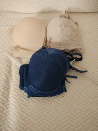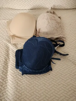 Conjunto de tres sujetadores con diferentes diseños. Sin uso Compré talla equivocada - Sujetador negro con detalles de encaje. - Sujetador gris con tirantes ajustables. - Sujetador blanco con acabado delicado.
