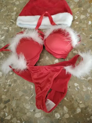 Conjunto de lencería con temática navideña. - Gorro de Santa Claus. - Sujetador. - Braguita. - Adornos de pelo blanco.