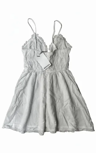 Precioso vestido mini de Bershka en color blanco con tirantes finos. Escote en pico con detalle de pequeños volantes en los bordes. Cuerpo fruncido tipo "nido de abeja" que se adapta perfectamente a la silueta y realza la cintura. Tela ligera con textura sutil, muy fresca y cómoda para días calurosos. Es un básico ideal que combina un estilo romántico y fresco, de estilo coquette. Talla XS, nuevo con etiqueta.