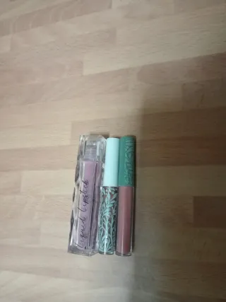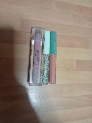 Set de pintalabios líquidos. - Un pintalabios en tono morado con acabado transparente. - Dos pintalabios en tono beige con diseño floral.
