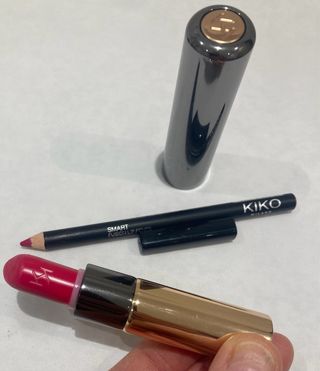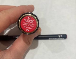 Set de maquillaje Kiko Milano que incluye un pintalabios y un lápiz labial. - Pintalabios: Gossamer Emotion, tono 141. - Lápiz labial: Tono 27.
