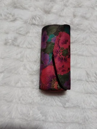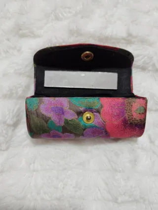 Elegante porta pintalabios con un bonito estampado floral. Incluye un espejo en su interior. - Diseño floral vibrante. - Cierre a presión dorado. - Interior forrado en negro. - Medias 9 x 4 cm