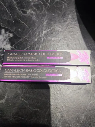 Dos labiales de Camaleon Cosmetic con acabado metálico. - Camaleon Magic Colourstick: barra de labios hidratante con color intenso. - Camaleon Basic Colourstick: barra de labios hidratante con color intenso. - Ambos contienen aloe vera, rosa mosqueta y manteca de cacao.