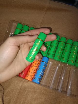 Preciosa colección de bálsamos labiales marroquíes. Se incluye un bálsamo labial verde y 23 adicionales en varios colores. Los bálsamos se ven nuevos y están en perfecto estado. - 24 bálsamos labiales en total - Colores variados - Diseño marroquí 2€ por unidad