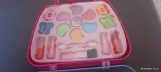 Estuche de maquillaje infantil con forma de bolso. - Incluye varios compartimentos con sombras de ojos y brillos. - Contiene aplicadores y pintalabios. - Diseño divertido y colorido.