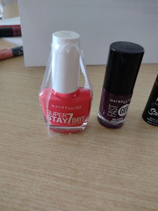 Maquillaje de Maybelline: Pintauñas Súper Satay tono 490 - 3€ Pintauñas Fast gel tono plum party - 2€ Pintalabios Nyx matte Lipstick tono sweet tooth - 7€ Mascara de pestañas falsies lash light tono ultra black - 5€ Precios por separado, todo junto 15€