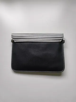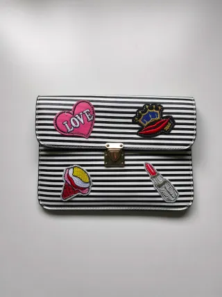 Bolso plano con estampado de rayas y parches. Tiene una cuerda para llevarlo de mano y otra para llevarlo colgado o cruzado. Está completamente nuevo, nunca se ha usado. - Parche de corazón con la palabra LOVE. - Parche de corona y labios. - Parche de helado. - Parche de pintalabios.