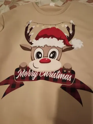 Vestido de manga larga con estampado navideño. - Diseño de reno con gorro de Papá Noel y luces. - Detalle de cinta a cuadros Merry Christmas. - Color base beige.