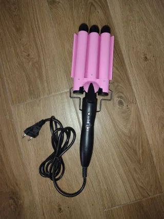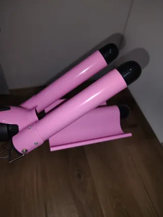 Rizador de pelo con tres tubos para crear ondas. - Dos ajustes de temperatura para usarlo según el acabado deseado o el tipo de pelo. - Color rosa y negro. - Mango ergonómico. - Soporte plegable para apoyar el rizador mientras está en uso.