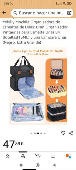 Mochila organizadora de esmaltes de uñas de la marca Yokilly. Comprada por error y sin estrenar. - Capacidad para 84 botellas de esmalte de uñas (15ML). - Incluye compartimentos para accesorios. - Color negro.