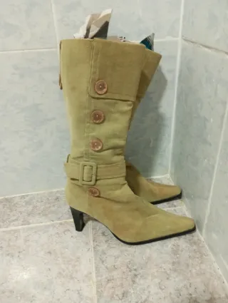 Botas altas de mujer en color beige. Tienen un diseño elegante con detalles. - Cierre con hebilla. - Adorno de botones. - Tacón fino.